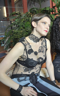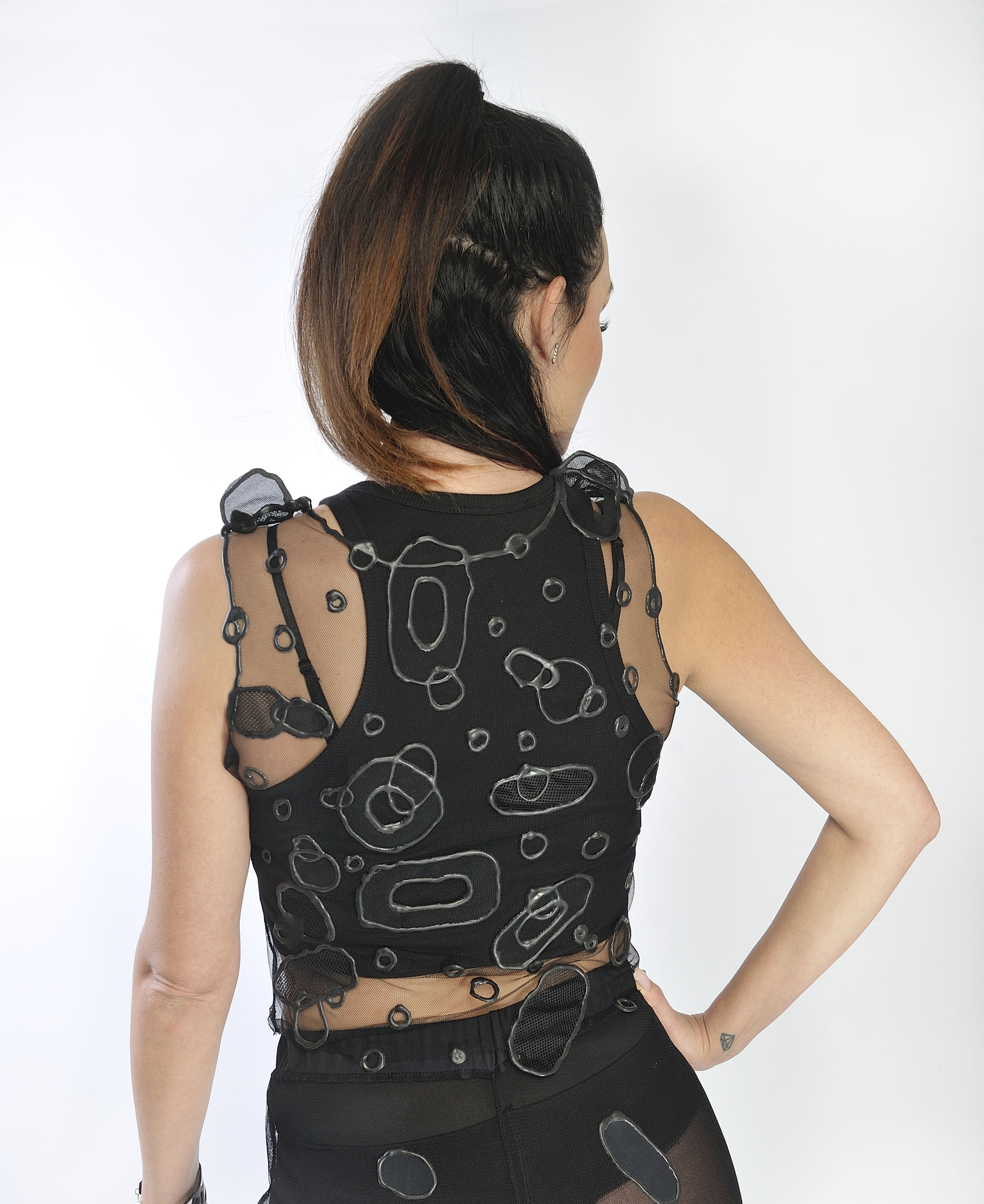 Top en maille transparente et latex noir, à porter directement sur la peau ou sur des dessous plus couvrants type débardeurs ou cols roulés selon la saison !